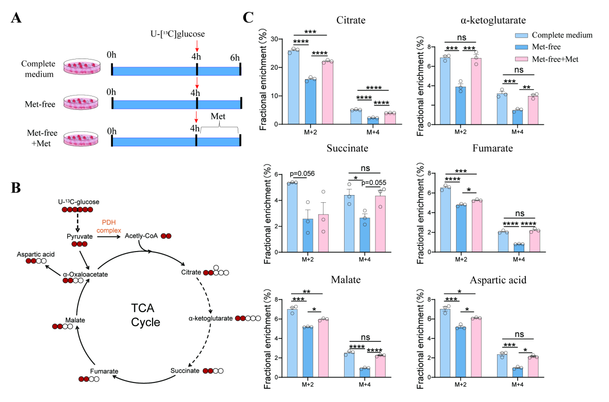 圖:通過碳同位素示蹤技術(13C-Glucose代謝流分析)發現,剝奪甲硫氨酸可顯著降低TCA循環代謝物(如檸檬酸、α-酮戊二酸)水平