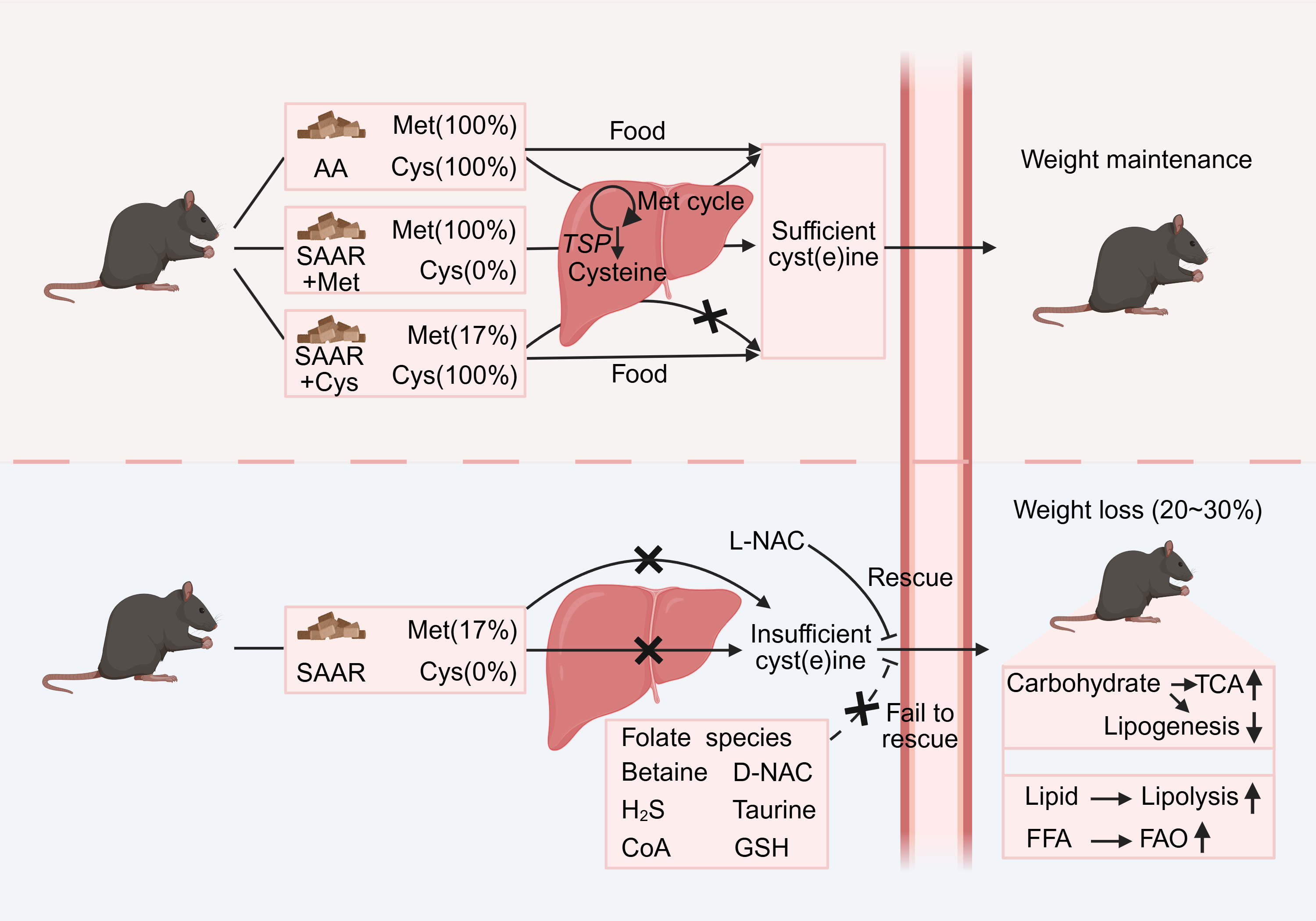 肥胖是誘發代謝綜合征的重要危險因素,目前的臨床干預手段如藥物治療、減重手術及生活方式管理可取得顯著成效,但其高昂費用、術后安全性、長期依賴及停藥后反彈等問題,也引發公眾相關困擾。近年來廣泛研究的飲食干預策略,如間歇性禁食(IF)、生酮飲食(KDs)及特定營養素限制,已被證實通過增強代謝信號,促進脂肪氧化等方式對體重控制有效。然而,長期禁食引發的情緒低落、認知障礙、毛囊干細胞死亡以及長期高脂肪攝入引發的血脂、胃腸道異常等問題都難以避免。在限制特定營養素攝入的方法中,飲食氨基酸限制已被證實是一種強有效的抗肥胖策略。限制支鏈氨基酸(BCAAs)的攝入量,可通過抑制mTORC1活性、促進線粒體呼吸,從而增加能量消耗。但因BCAAs在肌肉蛋白質合成中的重要性,其攝入限制在不同人群中的安全性和適用性仍有待考量。SAAs也因其在慢病進展中的多方面作用,近年來備受關注。甲硫氨酸限制被發現在不同物種中均與壽命延長、胰島素敏感性增強及氧化應激減少相關,(半)胱氨酸則在氧化還原穩態及鐵死亡(ferroptosis)等領域,尤其是腫瘤學中被廣泛研究。然而,甲硫氨酸與(半)胱氨酸的單獨及聯合作用對減重的調控機制仍不清楚。