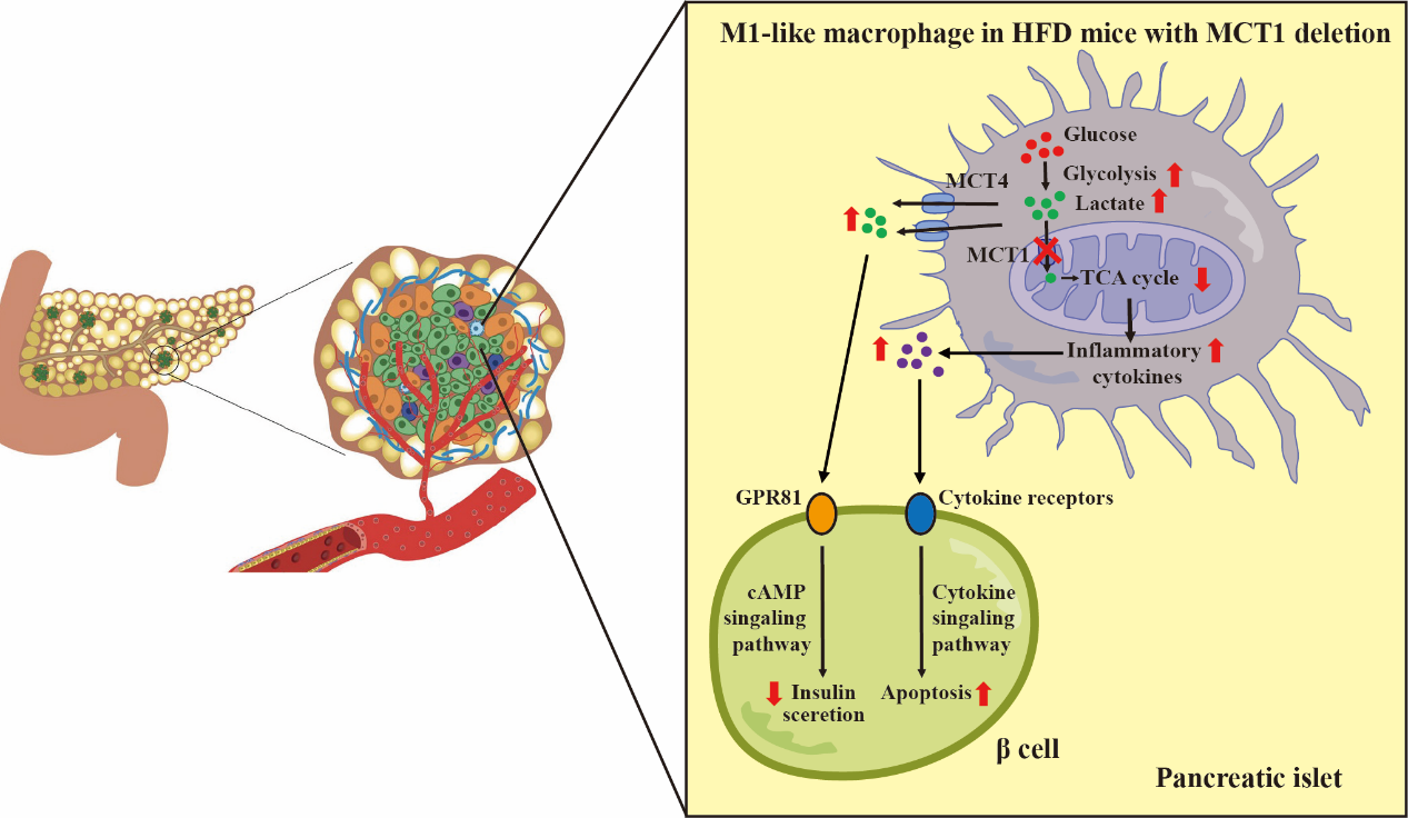 肥胖是21世紀(jì)最嚴(yán)峻的公共衛(wèi)生挑戰(zhàn)之一,也是糖尿病的重要誘因。 肥胖誘導(dǎo)的慢性低度炎癥重塑胰島免疫微環(huán)境,導(dǎo)致巨噬細(xì)胞異常活化,直接或間接損害胰島β細(xì)胞功能。作為先天免疫的核心效應(yīng)細(xì)胞,巨噬細(xì)胞通過(guò)其表型極化、炎性因子分泌及免疫互作網(wǎng)絡(luò),參與了胰島損傷和糖尿病進(jìn)程。多項(xiàng)研究表明,相較于非糖尿病人群,1型和2型糖尿病患者均表現(xiàn)出基礎(chǔ)血乳酸水平升高。值得注意的是,在2型糖尿病肥胖受試者中觀察到的血漿乳酸濃度,顯著高于非肥胖、非糖尿病的對(duì)照組個(gè)體。此外,糖耐量受損個(gè)體的血乳酸水平也顯著高于糖耐量正常者。然而,基礎(chǔ)血乳酸濃度的升高,是否是導(dǎo)致糖尿病的發(fā)病機(jī)制,尚不明確。