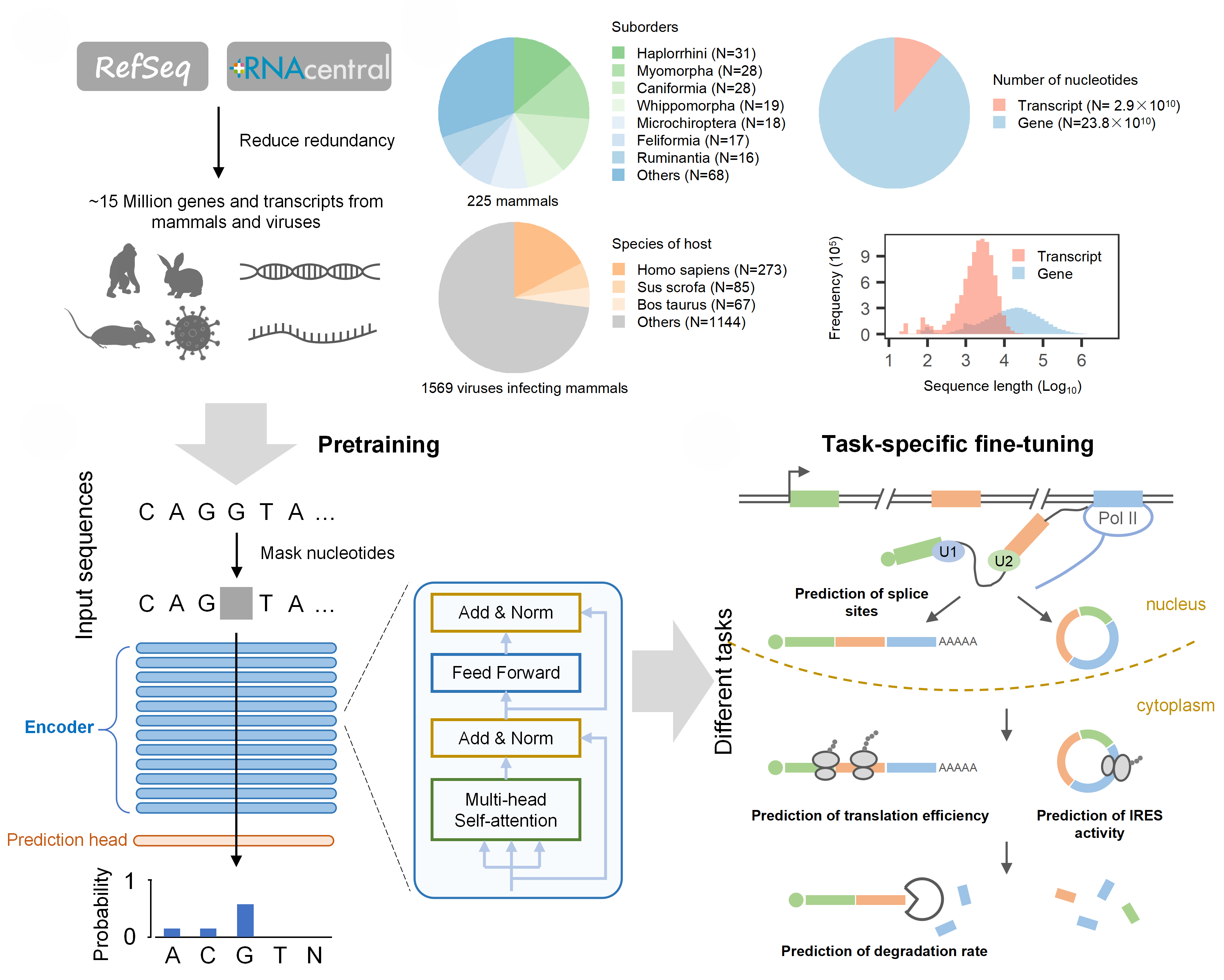 9月24日,國際學術期刊Genome Biology在線發表了中國科學院上海營養與健康研究所生物醫學大數據中心張國慶研究員與南方科技大學生命科學學院系統生物學系王澤峰講席教授團隊的合作論文“A foundation language model to decipher diverse regulation of RNAs”。該研究構建了一種基于深度神經網絡的預訓練模型,可微調預測pre-mRNA的剪接位點、mRNA的翻譯效率、mRNA的降解率和內部核糖體進入位點(Internal Ribosome Entry Site,IRES)等多個RNA調控相關的下游任務,揭示了RNA中調控元件的序列特征并鑒定新型翻譯調控元件,為理解RNA調控機制和優化RNA的生物醫學應用提供了新工具和新思路。
