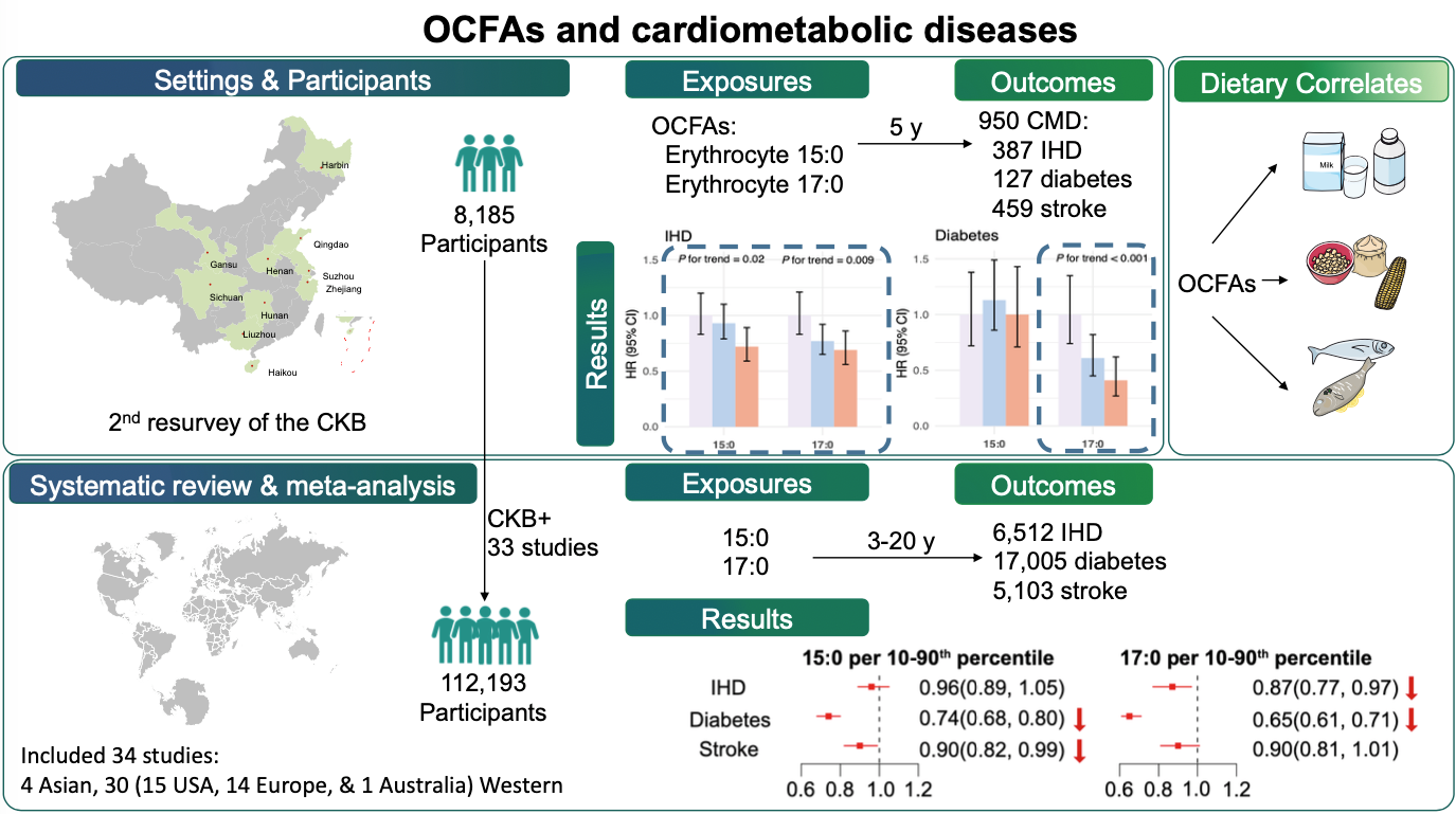 圖:基于中國慢性病前瞻性研究(China Kadoorie Biobank, CKB)和全球最新薈萃分析,發(fā)現(xiàn)兩種主要奇數(shù)碳脂肪酸(Odd-Chain Fatty Acids, OCFAs)對心血管代謝性疾病風險呈現(xiàn)保護性關聯(lián)作用。